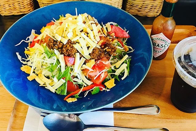 カラフルな見た目が気分を上げる「タコライス(単品900円、アイスコーヒーセット1, 100円)」。ランチメニューの中でも人気商品。