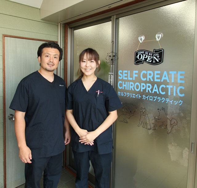 ご夫婦で経営する「セルフクリエイト カイロプラクティック」の前で。予防医学のため、症状がなくても通院可能とのこと。