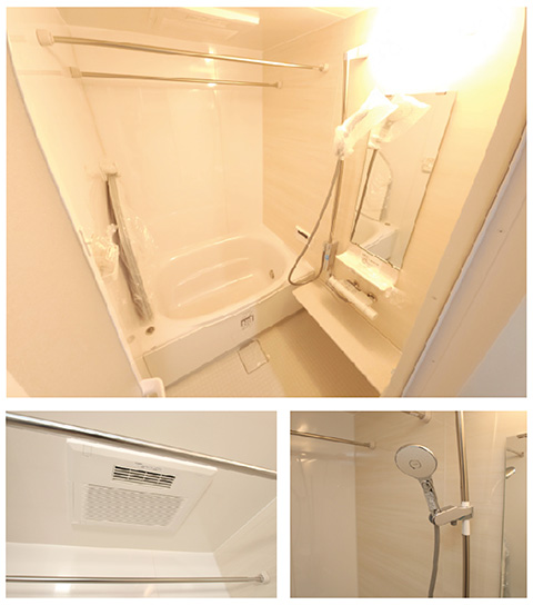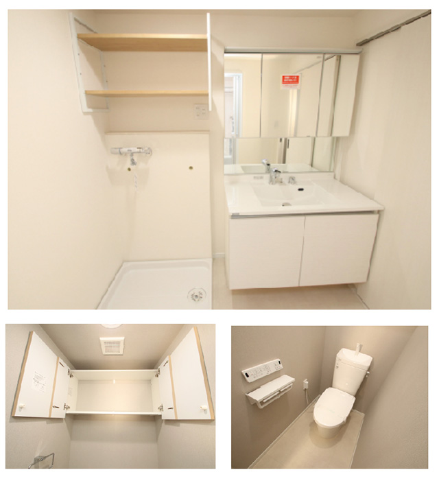 化粧室には奥行きのある収納力の高い独立洗面台を採用。タッチレススイッチ式の照明と水栓で、手が汚れているときでもスイッチに触れることなく、オン・オフの操作が可能です。ユニットバスには、汚れがつきにくい表面処理を施しており、お手入れも簡単。節水効果のあるエコシャワーヘッドと、保温構造の「サーモバス」により、お湯が冷めにくく、快適なバスタイムをサポートします。