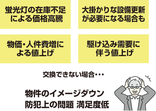 2028年からは一般照明用の蛍光灯の製造・輸出入ができなくなります。ただし、蛍光灯の使用自体は禁止されません。すでに設置されている蛍光灯はそのまま使用でき、交換用在庫があれば使い続けることも可能です。しかし、新たに製造されなくなる以上、いずれLED照明への切り替えは不可避です。 今後は在庫減少や物価高騰で蛍光灯の価格がさらに上昇すると予想されます。実際、メディア報道によれば2024年7月時点で蛍光灯の価格は前年比80%以上上昇しています。製造業における原材料費・物流費・人件費も上昇を続けており、さらなる値上げが懸念されます。こうしたコスト増は、不動産経営のランニングコスト上昇にも直結します。政府も2030年までに照明の100%LED化を目標としており、今後は計画的にLED照明へ移行することが求められます。