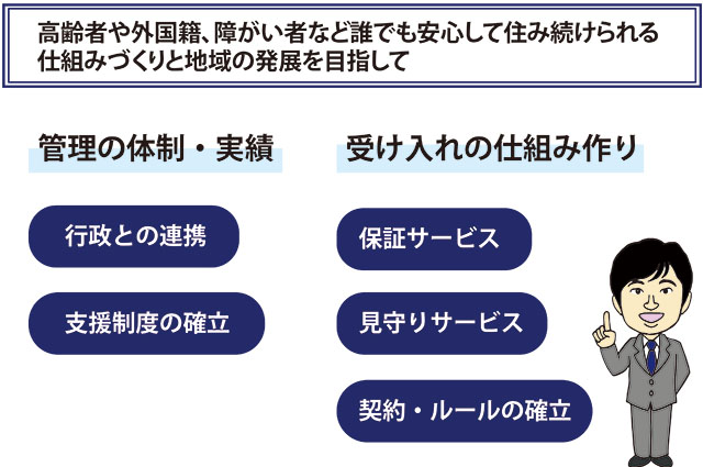 長年にわたり住宅の仲介と管理を行ってきた中、弊社では「住宅の確保に困っている方への支援」に少しずつ取り組んでまいりました。貸主様がリスクを感じ、マッチングが難しくなることもあります。そうした課題に対し、行政が進める制度や取り組みに協力しながら、弊社としても入居に向けた支援を行っています。具体的には、管理会社としての体制と実績を前提として入居可能な住居の確保や住宅確保要配慮者に対応した「保証サービス」の整備、さらに入居後の「見守りサービス」や行政と連携した包括的なサポートの提供を実施しています。また、居住支援協議会にも参加し、管理会社として地域の課題解決に積極的に取り組んでおります。