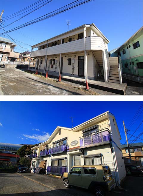 学生向けのワンルーム(上)とファミリー向け(下)の2LDKの物件。小田急線「鶴巻温泉駅」から徒歩約5分の過ごしやすい環境にあります。自主管理で丁寧にメンテナンスを行っている物件は満室をキープしています。