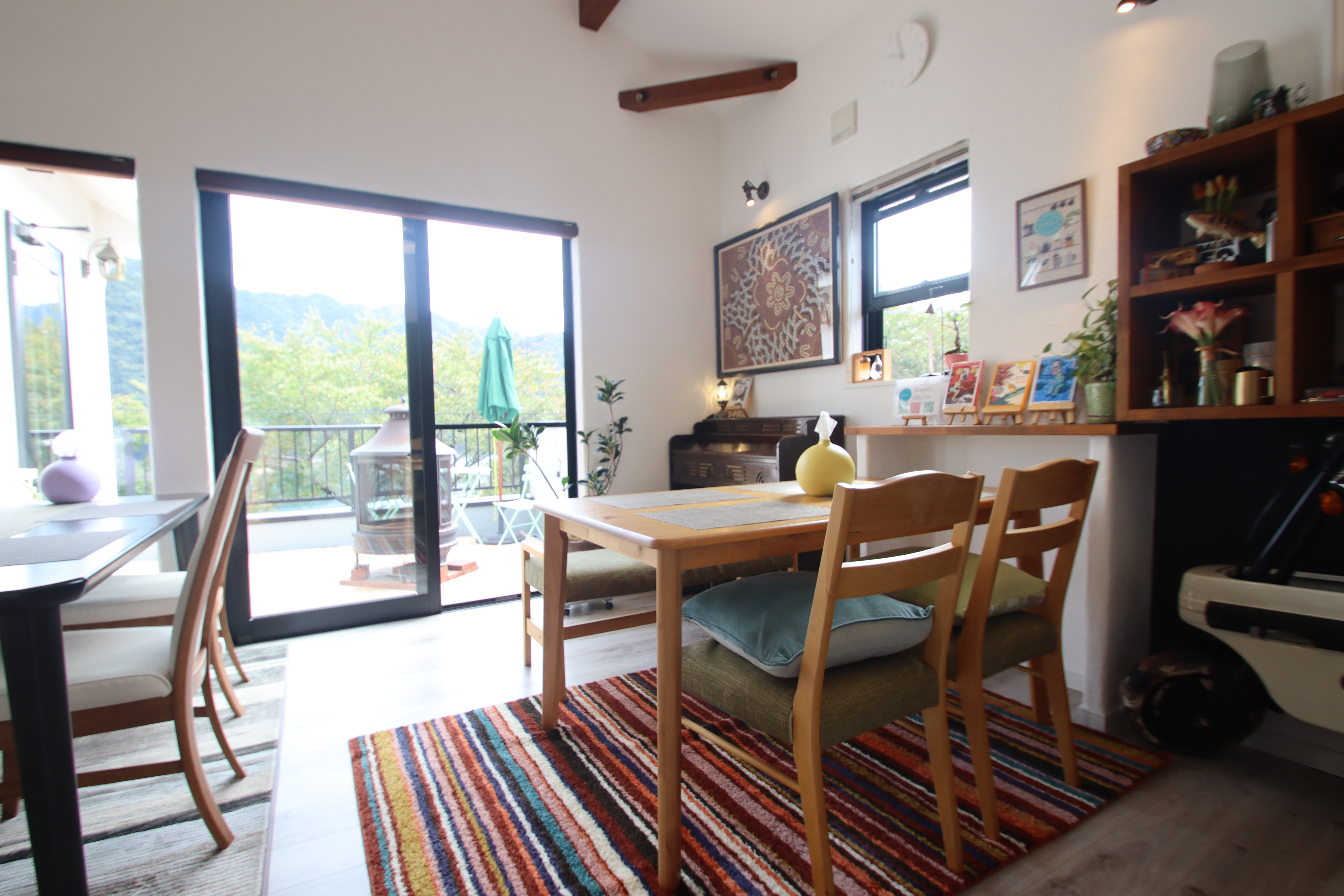 オーナーは自動車メーカーのディーラーを退職後、2022年長年の夢だったカフェをオープンしました。「広いテラスとBBQスペース、白い漆喰壁にフローリング、木の梁が映える、水辺を望む高台のカフェをずっと思い描いていました。探して3年、まさに理想の家とめぐり合えたんです」。クルマやバイク、漫画「ハートカクテル」など、店内にはオーナーお気に入りのアイテム達が並びます。