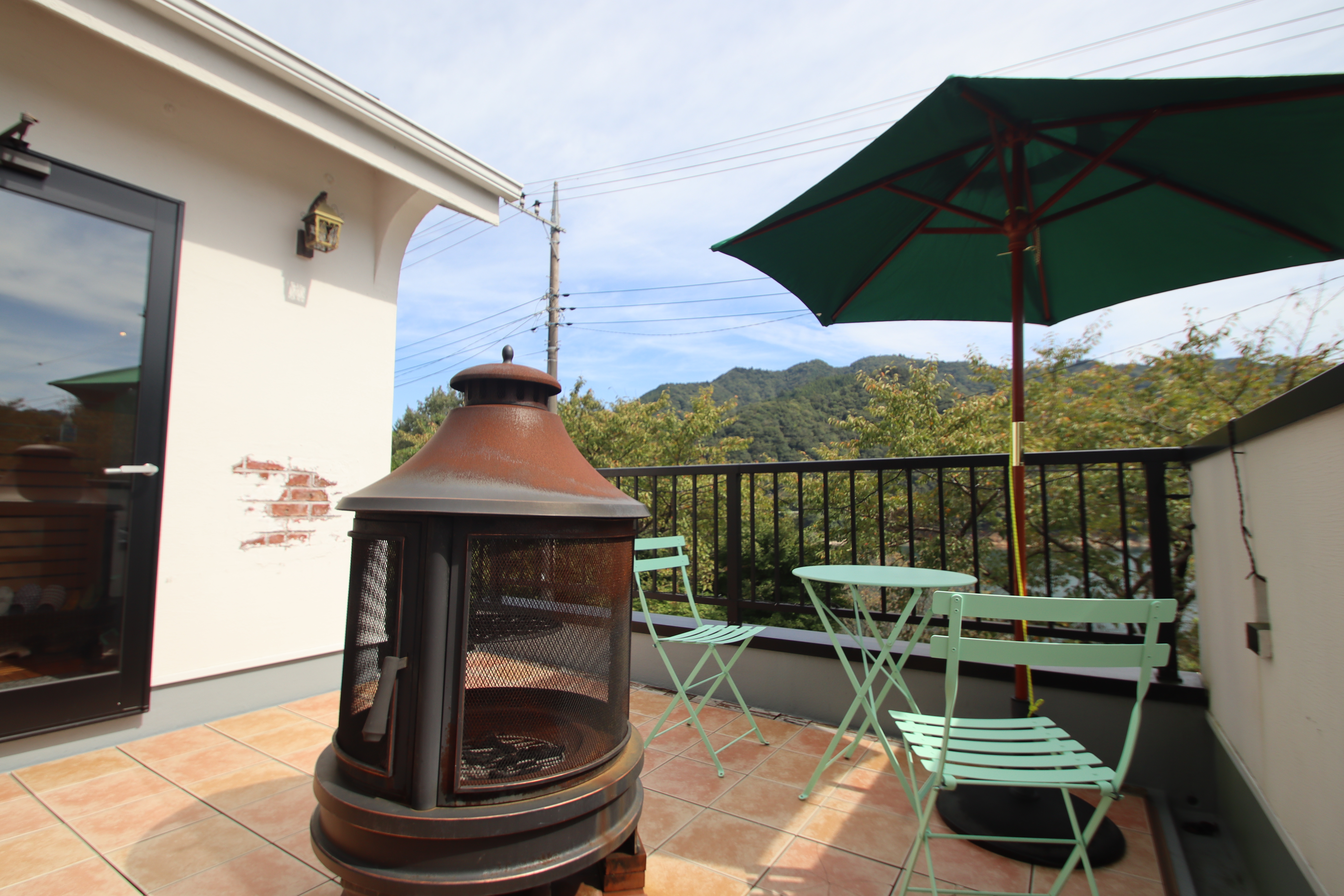 入口横には風を感じられるテラス席。ファイヤーピット(焚火台)がおかれ、焚き火やBBQも可能です。