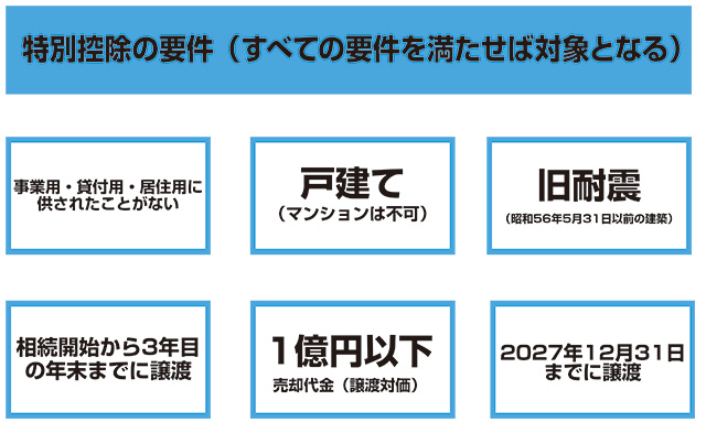 1.被相続人が介護保険法に規定する要介護認定等を受け、かつ相続直前まで老人ホーム等に入居していたこと。2.被相続人が老人ホーム等に入所した時から相続開始の直前までその家屋はその者による一定の使用がなされ、かつ、事業の用、貸付の用又はその者以外の者の居住の用に供されていたことがない。